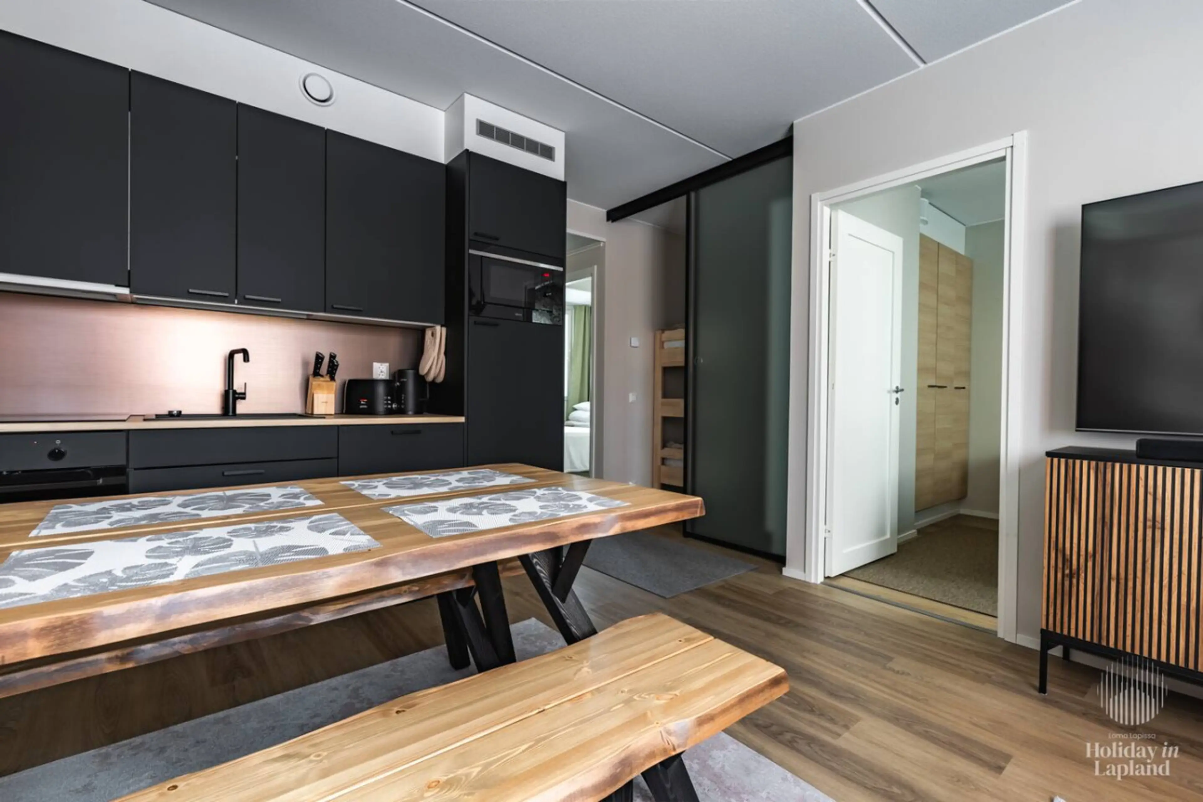 Newly completed lovely apartment with sauna! Accommodates up to 6 people. This apartment is the perfect base for your adventures in Lapland: well-equipped, spacious and located in a peaceful corner right near Levi center. Linen: Additional order or own Final cleaning: Added to the price for care...