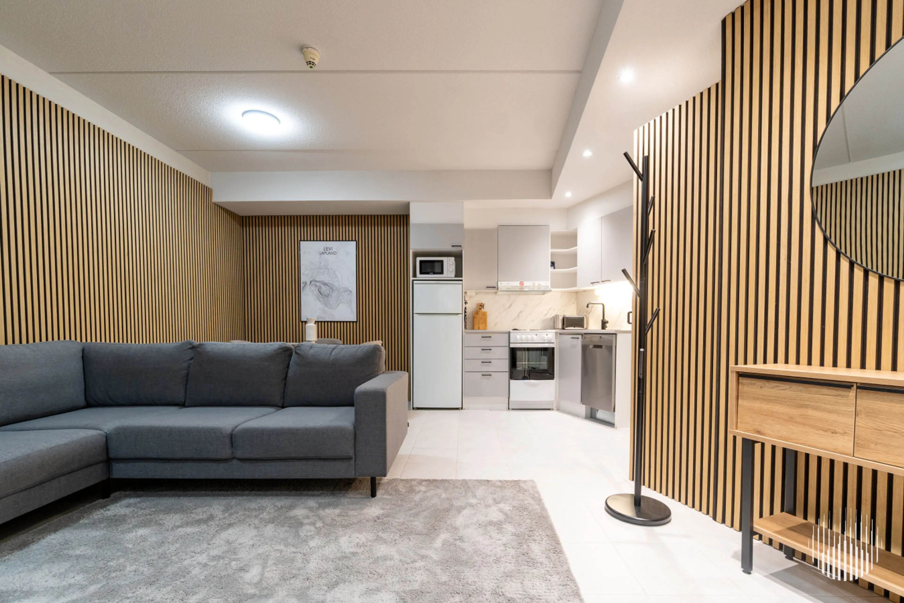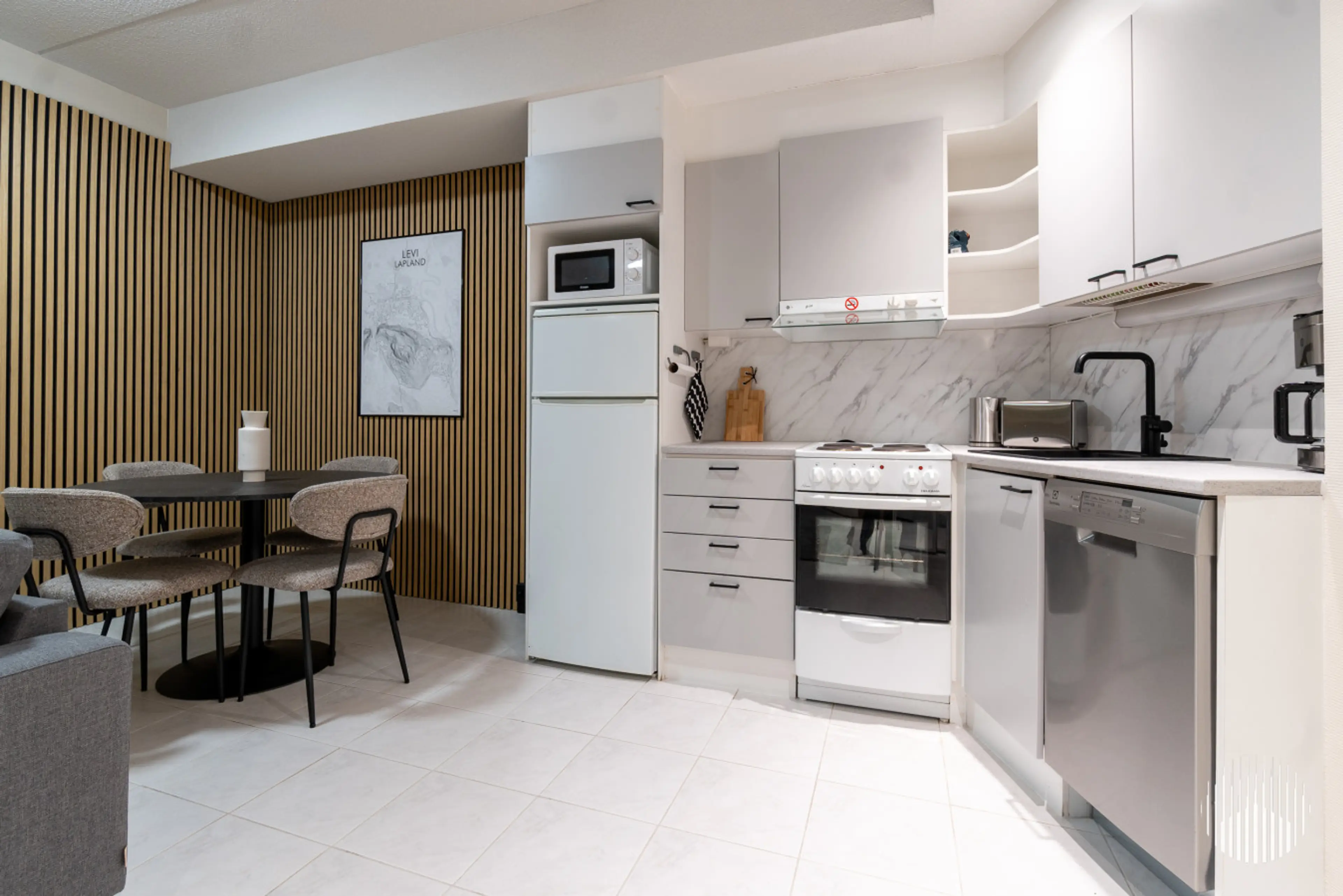 Modern and spacious apartment with private sauna close to Levi's center and services, accommodates 1-4 guests. The apartment has a comfortable space with kitchen corner and living room, private sauna and two bedrooms with single beds. The well equipped kitchen offers the opportunity to use e.g. ov...